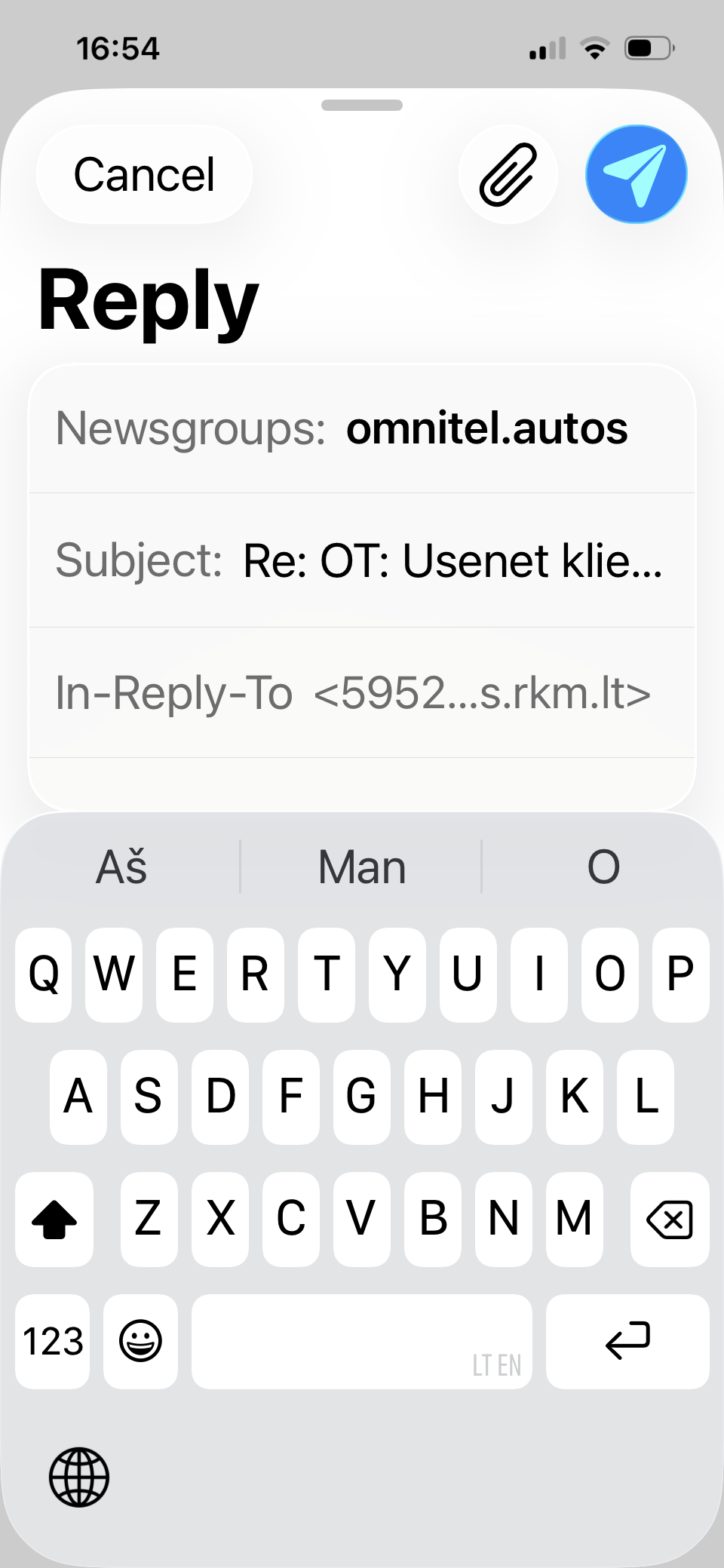 On 6 Mar 2026 at 16:53, Zhiniukas wrote: > Ant ifono daugiau kaip pusę ekrano užima headeriai ir subjectas. Tekstui vietos beveik nelieka. Replajų rašyt irgi nepavyksta. Headeriai visą vietą iki klaviatūros užima. On 3 Mar 2026 at 09:59, Diablo wrote: > Hau, Padariau Usenet klienta %subj% platformoms, nes why not ir AI padeda. Visas šviežias ir naujas, tai bus spragelių, bet postinti ir pezalioti jau dabar galima. Norintiems patestuoti, linkas: https://testflight.apple.com/join/tK6vgFVD Neužilgo atsiras ir AppStore’uose.