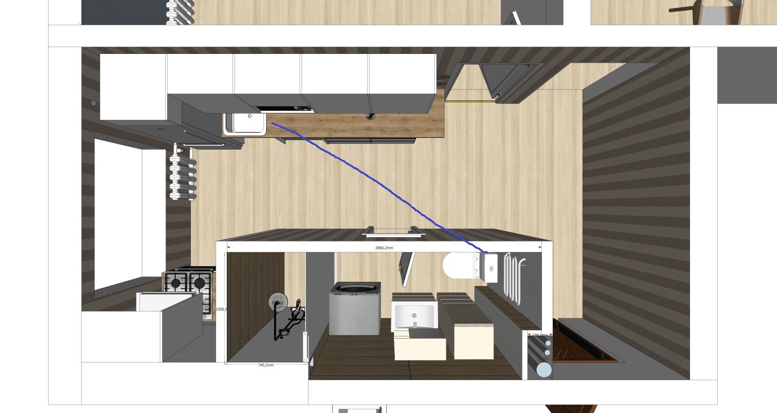 Pasipaisem kazkoki vonios ir virtuves brezinuka, ir mintis, kad kriaukle butu prie visai kitos sienos nei standartiskai buna. Grindys dar pasikels apie 10cm - mazdaug 5cm vatos/puplascio + 5cm betono. Ar galima nuoteku vamdzi tiesti panasiai kaip melyna linija nupiesiau ir ji uzbetonuoti? Ar cia turetu buti kazkoks spec vamdzis, ar gali buti tas standartinis plastikinis 5cm diametro vamdzis? Niekad neteko vamdziu uzbetonuoti grindyse, visada palei sienas prasivesdavom, tai kazkaip neramu, ypac kai butas ne pirmam aukste :) Dekui.