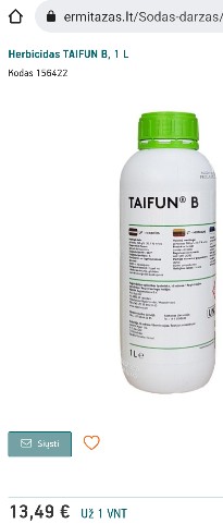 https://www.ermitazas.lt/Sodas-darzas/Sodo-darzo-prekes/Apsauga-agrochemija/Augalu-apsaugos-produktai/Herbicidas-TAIFUN-B-1-l-156422.html Sita pirkau ermitaze per akcija uz ~9e. Taspats glifosatas, tik berods, Izraelyje darytas. Kiemo zolei - liuks suveike. Krastuose ir didesniu kazkiek liko, bet irgi gerai - nenorejau kad butu dykuma. Purskiau siemet tik 1 karta. Dar daug liko, pavasari vel uzvarysiu. Ji atzelia po truputi, sunkiai, bet ne toks miskas koks buvo. -- shadow <shadow.arth@yahoo.com> Wrote in message:r > -ir senukuose yra, tik reikia konsultanta pasigauti, kad spinta atrakintu.Eile metu naudojau roundapa ir pastebejau nuolat silpnejanti veikima. Pasidomejus paaiskejo, jog del ivairiu draudimu/ribojimu gausiai sumazinta veikliosios medziagos koncentracija. Pazistamas agronomas pasiule pabandyti sita: https://www.ermitazas.lt/Sodas-darzas/Sodo-darzo-prekes/Apsauga-agrochemija/Augalu-apsaugos-produktai/Herbicidas-OURAGAN-SYSTEM-4-1-l-155124.html. Suveike kaip ankstesnis roundap-- shadow ----Android NewsGroup Reader---- https://piaohong.s3-us-west-2.amazonaws.com/usenet/index.html