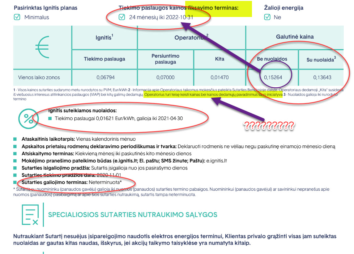 Aš nesuprantu - mano sutarty fiksuotos kainos iki 2022.10.31 ,o pastaboj rašo, kad operatorius turi teisę keisti kainas... ??? Tai gal po tos fiksuotos(2022.10.31) datos?. Suprantu, kad iki 2022.10.31 kaina bus 0,15264 Toliau žiūrėsim... O kaip dėl nutraukimo? Sutartis rašo(apačioj) neterminuota, o fiksuota kaina terminuota... Tai nereiktų gražinti nuolaidos? On 12/2/2021 7:51 AM, Tomas wrote: > Ignitis yra brangiausias, Perlas - pigiausias. Tai viskas ką reikia > žinoti apie tiekėjus ir jų pasirinkimą. > > On 2021-12-01 15:43, bezas wrote: >> Truputi jau nebespeju su kainom ir pulsu. >> Ignitis ka tik atsiunte naujas kainas naujiems metams ir matau įpiešta >> dienine 28ct kwh, cia dabar jau tokios kainos? >> dabar yra ~18ct o kur nepasirinktas tiekejas moku 15ct. >> Su ugniciu sudariau sutartį vasarą dėl "paprastumo" >> Sutartis neterminuota optimali ar galiu bandyti laimės ieškoti kitur >> be didelių popierizmų? >