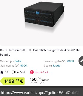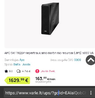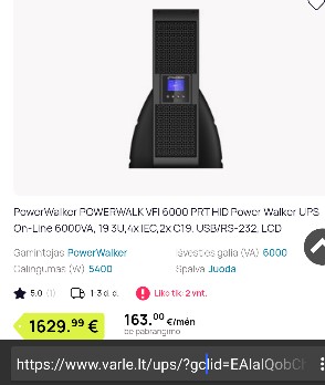 Pasidomejau, pirmas guglo "Ad" linkas i varle. Visada galima ieskot pigesniu kituose linkuose. Pasidairius naudoto - kaina nukristu maziausiai 50% ar daugiau. Net panagrinejau ta 8kw be akumu - svinas, namuose drasiai galima jungt pora didesniu masininiu po 120 Ah. So sumoj su 500w generu galima tilpt i 1000 - 1500e ir turet patikimai veikiancia avarine sistema. Pasidare idomu suzinot kiek galios realiai pasiurbia mano SS. -- Arj <root@ibm.com> Wrote in message:r > 2022-03-10 16:12, Caponi rašė:> O tu pasidomėk taip laisvalaikiu, kiek kainuoja UPS'as, kuris gali > "isduoti 6kw" :-)> > Jau nešnekant apie tai, kad su UPS'ų ir "pigių generų" santykiavimu irgi > niuansu yra.> nu cia ta sritis kur "gerai" kainuoja labai brangiai. va paskaitai - "pastatem ligoninei 30kw ups'o+generatoriaus avarinio tiekimo sistema, uz 2 mln Eur", kai koks 7kw generatorius su primityviu AVR kazkas link 1kEur. Minusas -antru atveju generatorius pasijungia po kokiu 30 sec ir elekros parametru stabilumas nestebuklingas ( ----Android NewsGroup Reader---- https://piaohong.s3-us-west-2.amazonaws.com/usenet/index.html