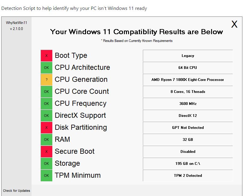 "Kipšas" <kipsasbepasto@blin.com> wrote in message news:sb6r1i$h8h$1@news.rkm.lt... > Atviro kodo programa parodys kodėl jūsų kompe negalės būti win11: > https://github.com/rcmaehl/WhyNotWin11