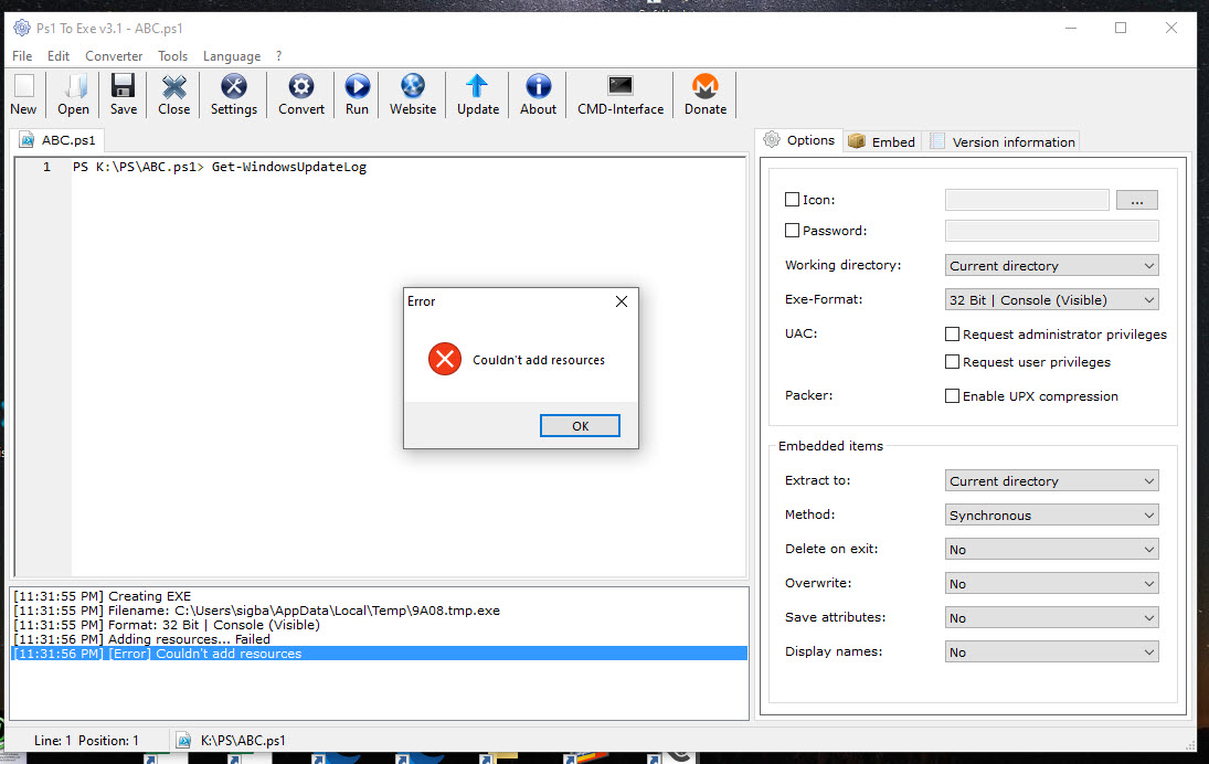 Kas čia kur ne taip? On 12/1/2021 11:19 PM, Sigitas wrote: > Gal būtų paprasčiau tokį naudoti? > https://ps1-to-exe.software.informer.com/ > Gal tuomet scriptai lengviau pasileistų... be jokių ten policijų... :) > > On 12/1/2021 10:12 PM, Laimis wrote: >> Sigitas rašė: >>> ... Nesugebu padaryti, kad ant ps1 failo paspaudus 2 kartus jis padarytų >>> savo darbą...Suveikia tik kai patį scriptą įdedu į >>> PS(Administrator)... :( >> >> Koks, koks tavo script'as ABC.ps1? :-) Ar man tik pasirodė ar jis ir yra: >> PS C:\Users\sigba> Get-WindowsUpdateLog >> >> ? >>