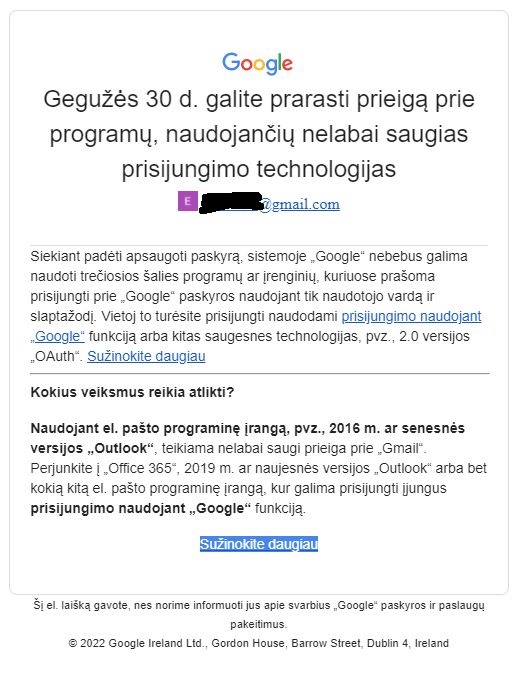 Paļæ½ystamas gavo ļæ½ gmailļæ½ laiļæ½kļæ½. Galite prarasti prieigļæ½ prie kai kuriļæ½ treļæ½iosios ļæ½alies programļæ½. Naudoti naujesnļæ½ outlookļæ½? Jis per jļæ½ skaito paļæ½tļæ½. Kļæ½ patartumļæ½te? Aļæ½iļæ½.
