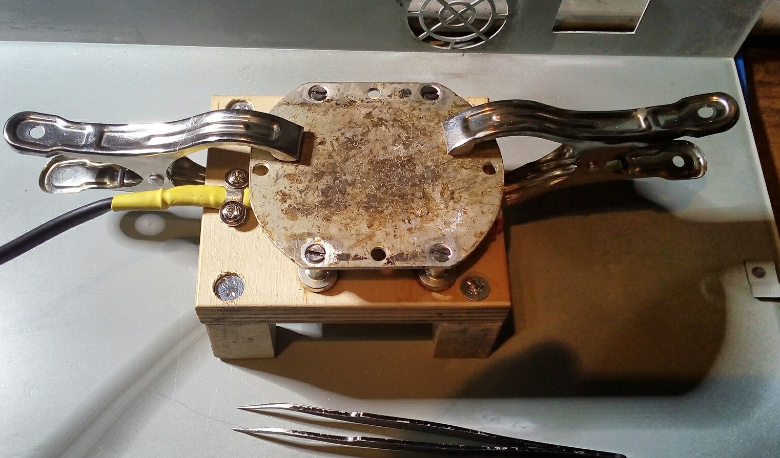 Pats sugalvojau... Jau lituoju... su kinietišku pečiuku... Kad neslydinėtų padariau kojytes iš faneros ir į jas iš apačios įleidau ф8x5 mm magetukus. Padedu ant kažkokio prietaiso korpuso skardos ir liuks... On 10/31/2021 1:07 PM, Kvadrupleckas wrote: > Is kokiu saltiniu gime ta tavo skema ?