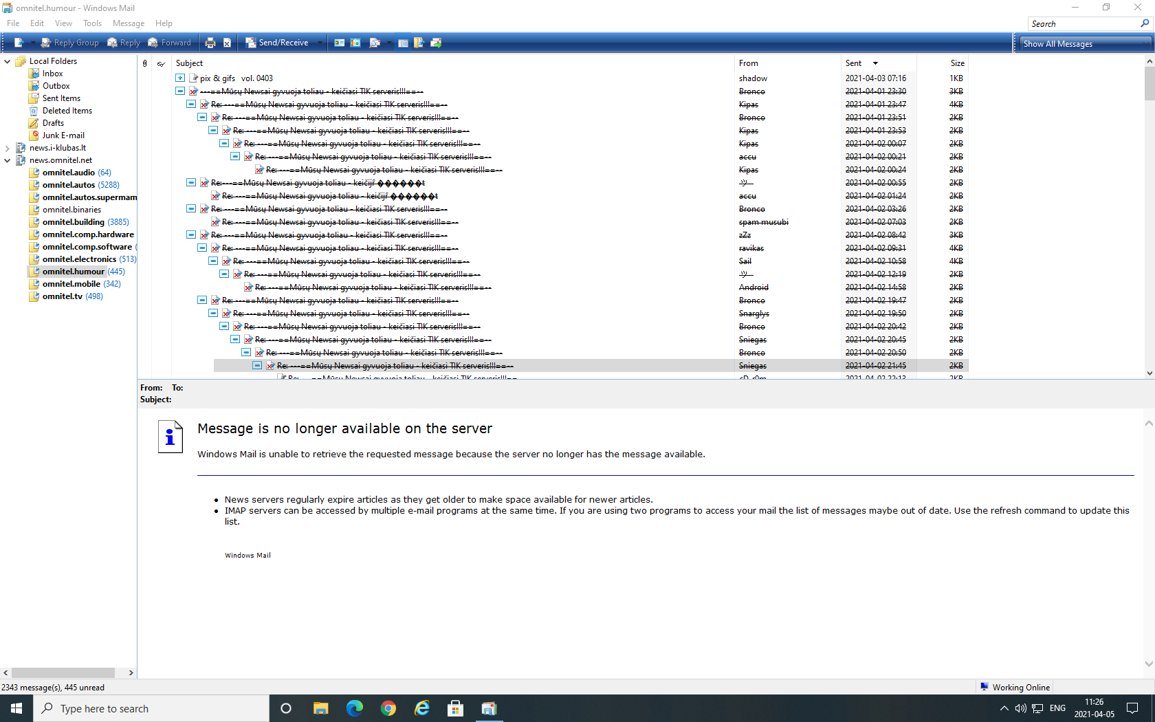 nu nzn. pakeiciau serveri is news.omnitel.net i news.rkm.lt. nu ir dingsta senos zinutes. virsutinis postas yra, o zemiau va. "ABLomas" <abl@xxx.lt> wrote in message news:s4e8un$9e3$1@news.rkm.lt... > On 2021-04-05 08:16, etikmat wrote: >> nu sorry, bet as irgi matau tik isskaidyta gif. > > Taip, tu sėdi i-klube, kuris didesnių žinučių nepriima :( > >> o rkm servas isvis mires jau antra diena. nauju zinuciu ner, o senos >> dingsta. > > Mat kaip... >