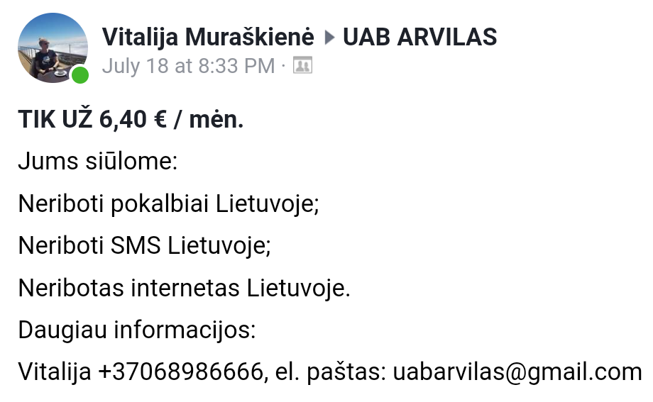 "J.J." <pavarde@microsoft.com> wrote in message news:tf969t$9t3$1@news.rkm.lt... > Pasi�l� po 10e � m�n, nusiun�iau � teledem�, jie po 12e pardavin�ja, > pamat� pasi�lym�, tai ir nuleido iki 10e � m�n. > > "android" para�� naujien� news:tb6l0f$o3$1@news.rkm.lt... > FB susirask UAB ARVILAS > viskas neribota bites tinkle po 6 e/men >